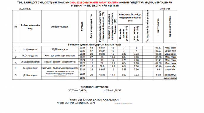 ТӨВ, БАЯНЦОГТ СУМ, (ЗДТГ)-ЫН ТЖАХ-ЫН 2024, 2025 ОНЫ ЭХНИЙ ХАГАС ЖИЛИЙН АЖЛЫН ГҮЙЦЭТГЭЛ, ҮР ДҮН, МЭРГЭШЛИЙН ТҮВШИНГ ҮНЭЛСЭН ДҮНГИЙН НЭГТГЭЛ