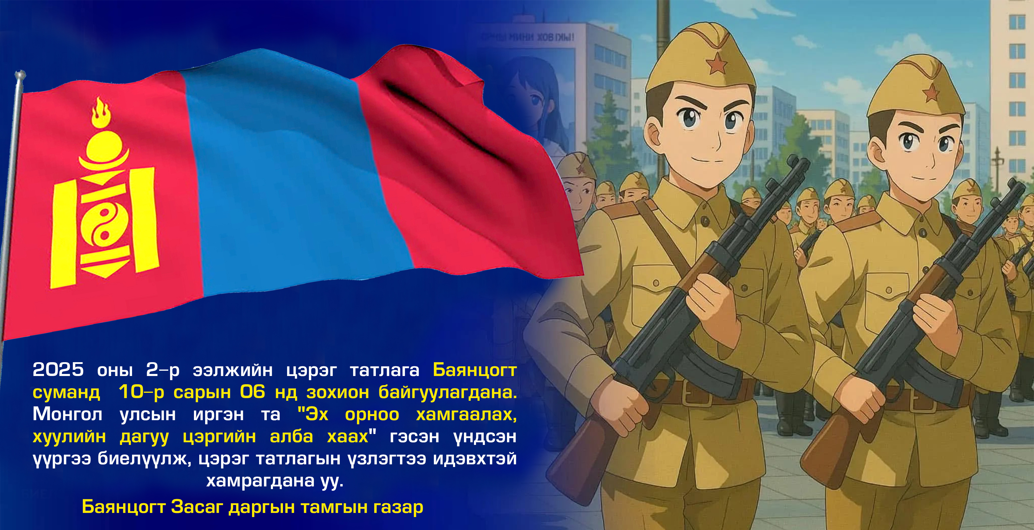 Цэргийн насны 18-25 насны иргэн та “Цэргийн зарлан дуудах хуудас” хүлээн авсан бол тогтоосон газар, цаг хугацаанд өөрийн биеэр ирж, Монгол Улсын Үндсэн хууль болон Цэргийн албаны тухай хуулийн дагуу “цэрэг татлагын товчооны үзлэг”-ээр орох үүрэгтэй. Хэрэв та цэргийн жинхэнэ албаны татлагаас зайлхийсэн бол хуулийн хүрээнд албадан саатуулах болон бусад хариуцлагыг хүлээлгэх болно.